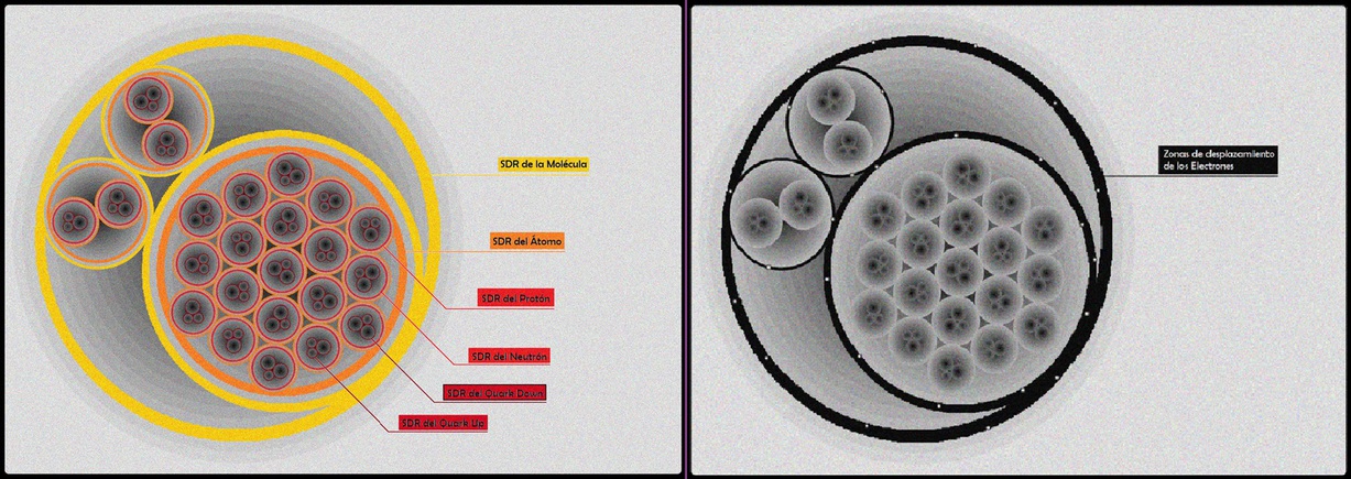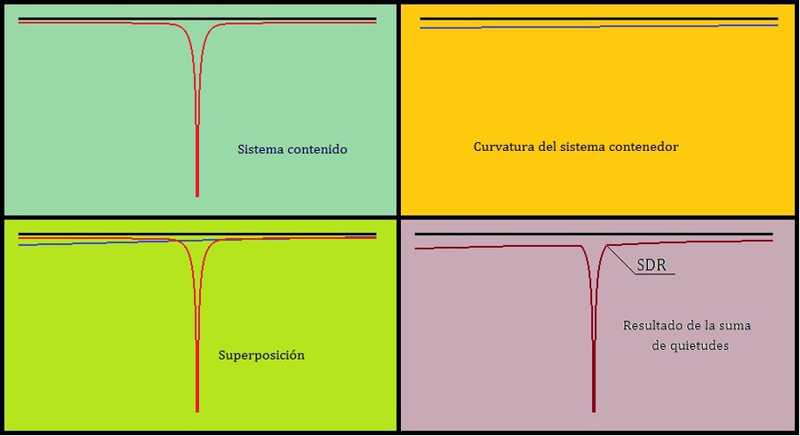 En todos los casos, cuando se desaceleran los movimientos más ligeros de un sistema contenedor, los SDR de los sistemas contenidos se desplazan hacia capas más interiores y lentas, para acoplar así sus velocidades al movimiento en el que se encuentran sumergidos. Eso provoca, en el sistema contenido una equivalente pérdida de tamaño y un equivalente aumento de la velocidad aparente según la fórmula que describe la relación entre velocidades reales y velocidades aparentes (VA = 1 / QS - QSDR).