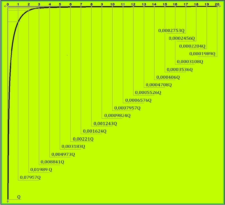 Por ejemplo: Una UM cuya velocidad inicial es de 1/4, y que, por efecto de una desaceleración disminuye a 1/5, sufre una merma en su cantidad real de movimiento y de volumen, de 0,0333…., y un correspondiente aumento de la quietud exactamente igual.